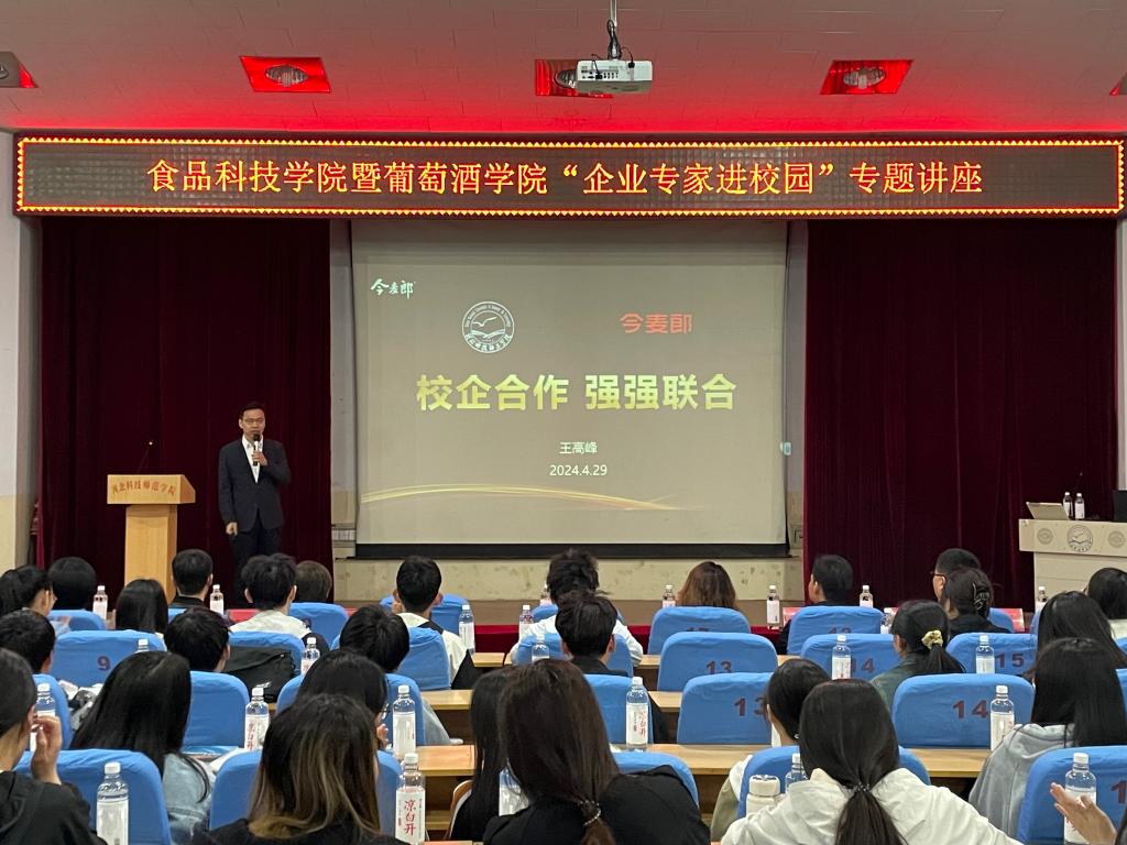 2024年4月29日,食品科技学院举办“企业专家进校园”专题讲座。今麦郎集团人力资源中心总经理王高峰、饮品事业部分公司总经理杨朋彦应邀主讲。今麦郎公司人力资源中心组发总监刘跃杰、饮品事业部人力资源总监宋立刚、饮品事业部人力资源经理高兴隆、人力资源中心招聘经理田杰文,食品科技学院领导班子成员、辅导员(班主任)以及部分在校本科生、研究生参加了讲座。