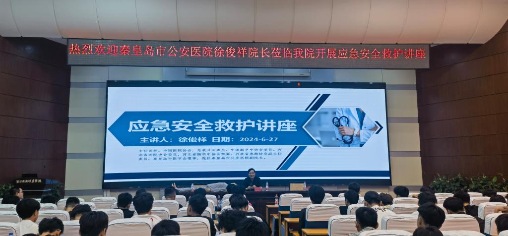 2024年6月27日,体育与健康学院开展“应急安全救护”专题讲座,秦皇岛市公安医院副院长徐俊祥应邀作讲座,学院党委副书记主持,辅导员班主任、2023级学生、其他年级班委以及研究生参加讲座培训。