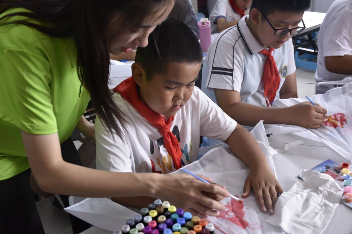 实践团成员与文昌里社区少年儿童合影留念(非遗漆扇)