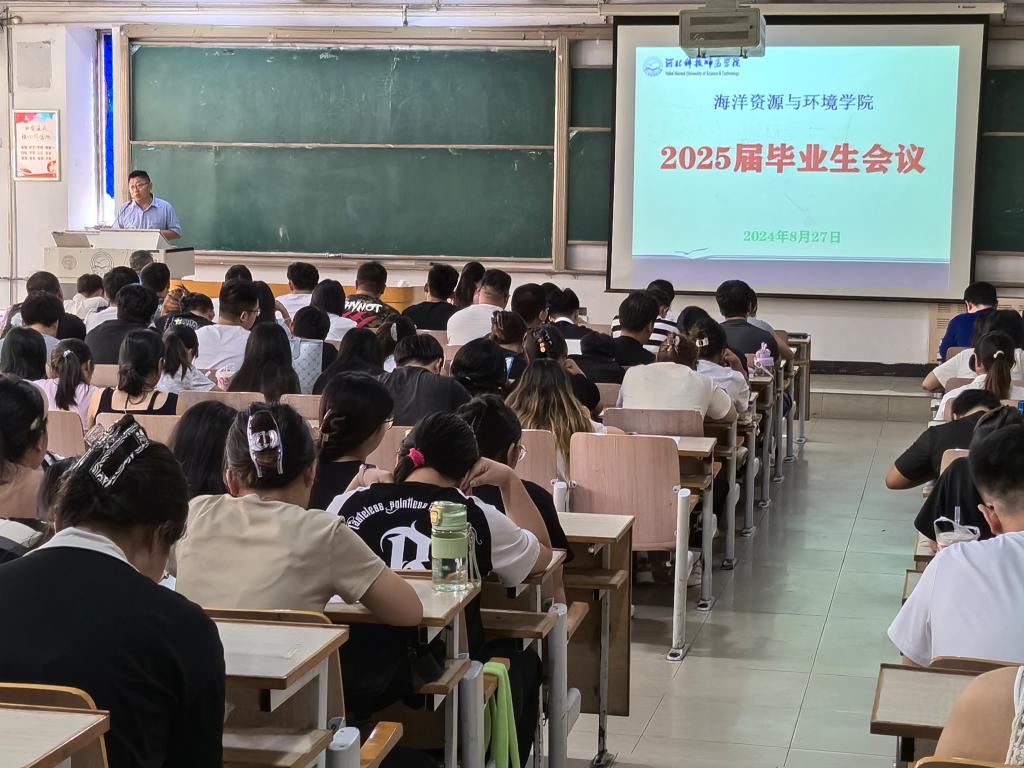 2024年8月27日,海洋资源与环境学院召开2025届全体毕业生会议,学院院长、学工办就业工作负责人、辅导员(班主任)代表及2025届全体毕业生参加会议。
