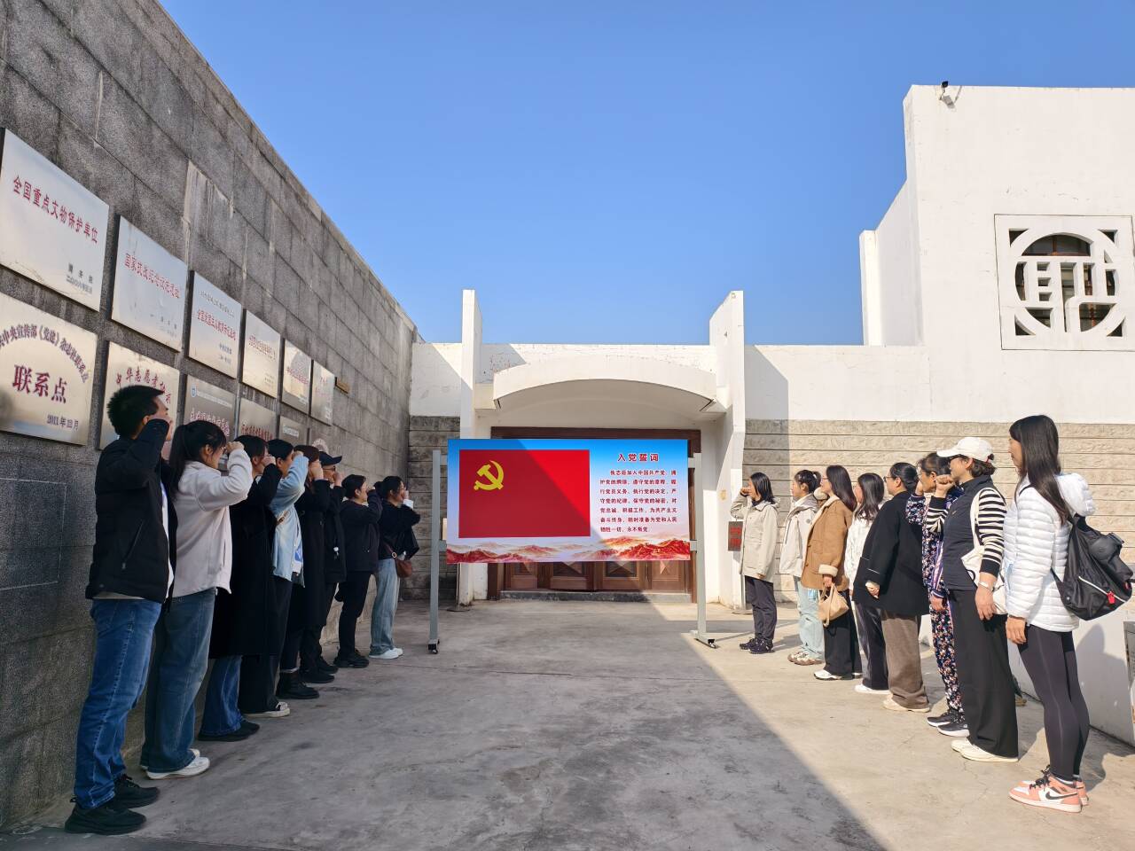 潘家峪是著名的抗日堡垒村,冀东抗日根据地的中枢,在潘家峪惨案纪念馆讲解员的带领下,党员们全面了解了惨案的经过,感受到了潘家峪人民抵抗日寇的决心和英勇无畏的爱国精神。在纪念馆外,全体党员以支部为单位重温了入党誓词。党员们面对党旗,举起右拳,重温对党和人民作出的庄严承诺,加强党性修养、坚定理想信念、牢记党的宗旨、践行党的誓言。