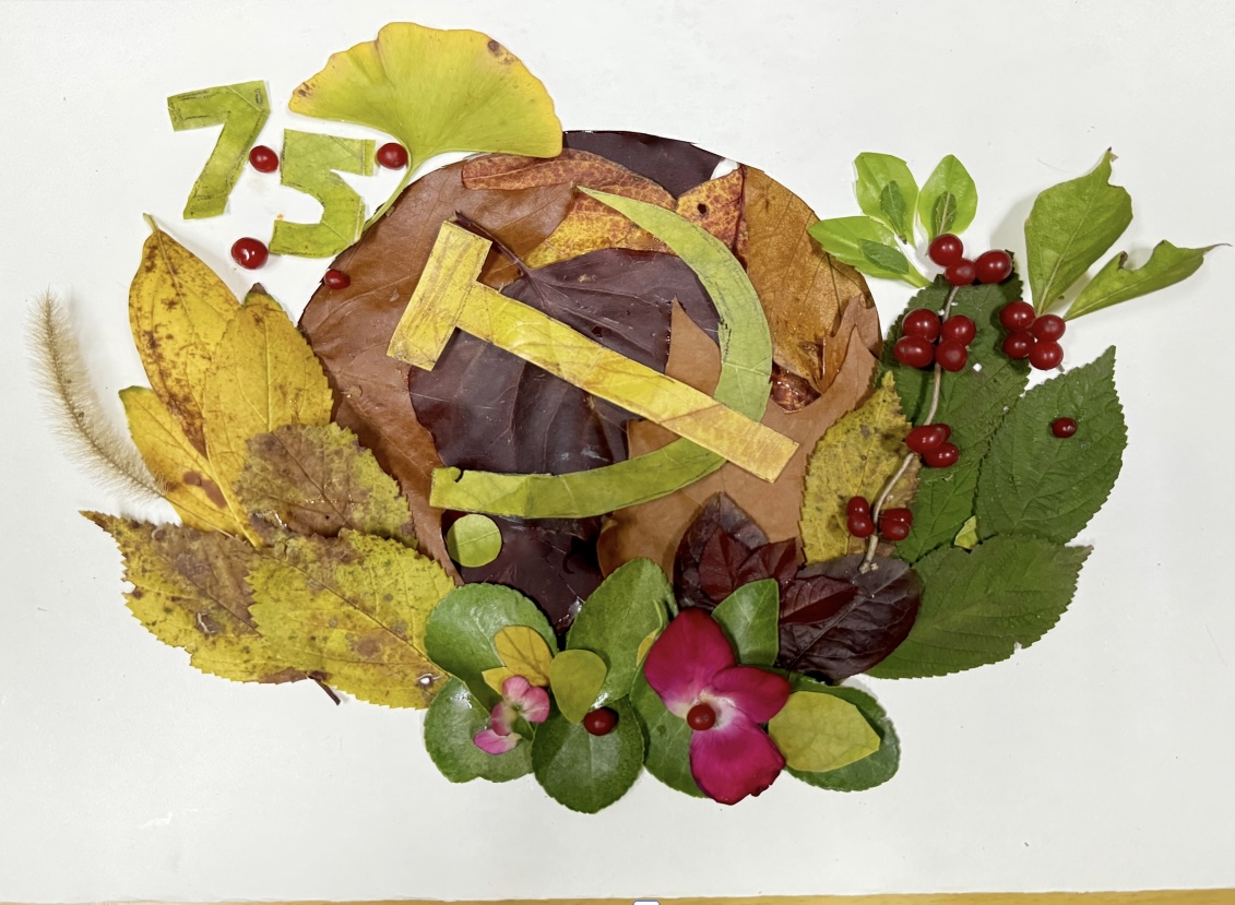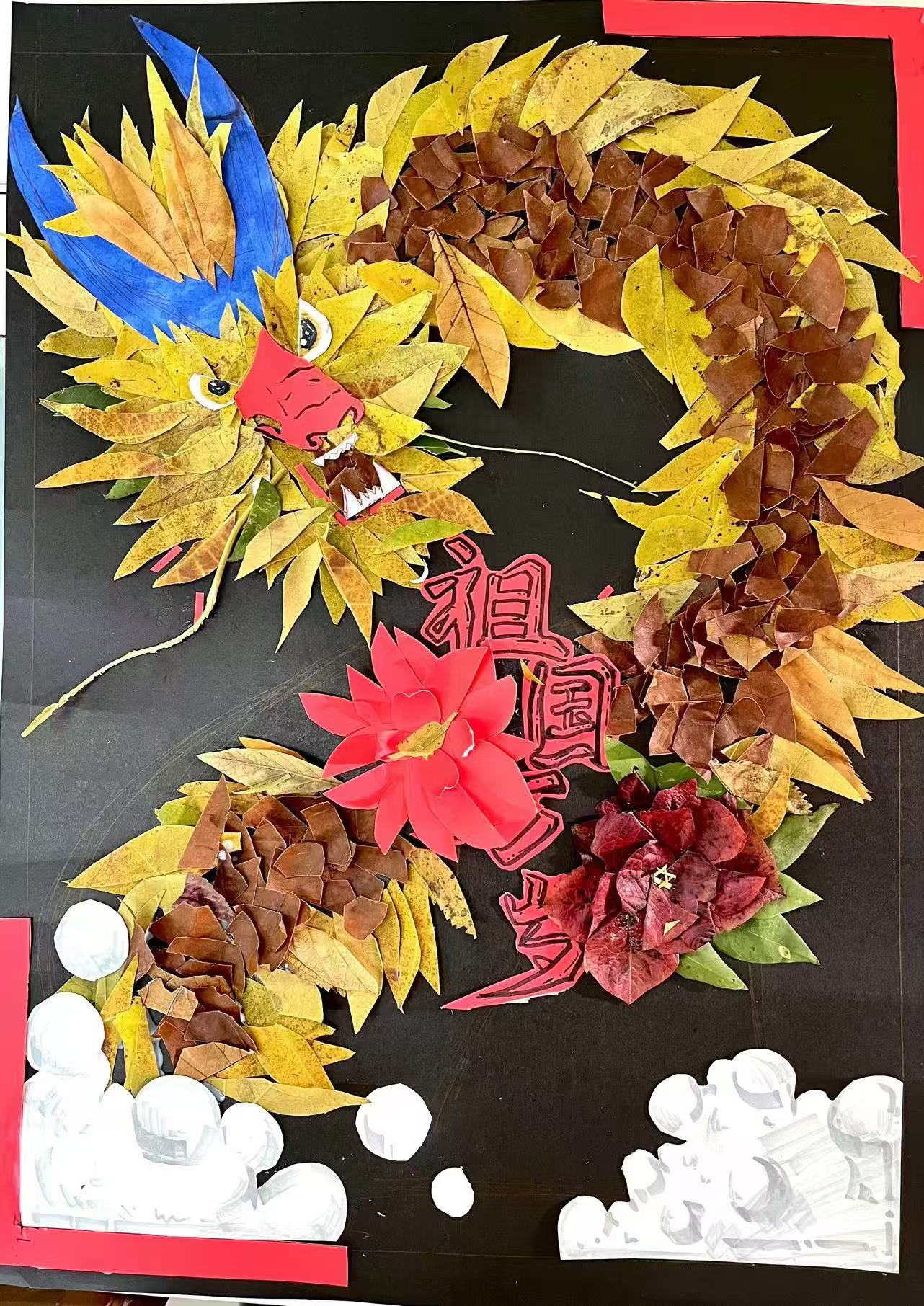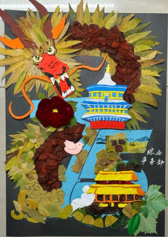 共有20余件作品进行了现场展示,同学们将在校园中收集到的各种颜色、各种形状的落叶进行创意拼接组合,制作出一幅幅充满想象力的作品。作品《致敬最可爱的人》以解放军战士为原型进行创作,运用了银杏叶、杨树叶、枫叶、樱桃树叶等色彩不同、形状各异的树叶,寓意着战士驻守边疆,保卫着国家安宁,民族团结,中华民族日益繁荣富强;作品《巨龙腾飞》用黄色、红色树叶拼贴成巨龙的形象,生动威猛,栩栩如生,龙身盘绕着天安门、天坛、75周年等意象,寓意着我们的祖国如一条腾飞的巨龙,巍然屹立在世界民族之林,展示着雄壮的大国气象;作品《盛世中华》用落叶拼贴和手绘共同创作出一幅壮丽画卷,画面中,一队人正在齐心协力攀登高山,山顶上红旗飘扬,象征着中国人民在党的领导下,团结一心、勇攀高峰,传达出一种强烈的爱国主义情怀和奋斗精神;其他作品也都各具创意,展示了对于祖国75周年华诞的深切祝福,对祖国深深的眷恋和热爱,同时也展示了对美的创作与热情,提醒人们珍惜自然、保护环境,为守护祖国的美丽山河做出贡献。