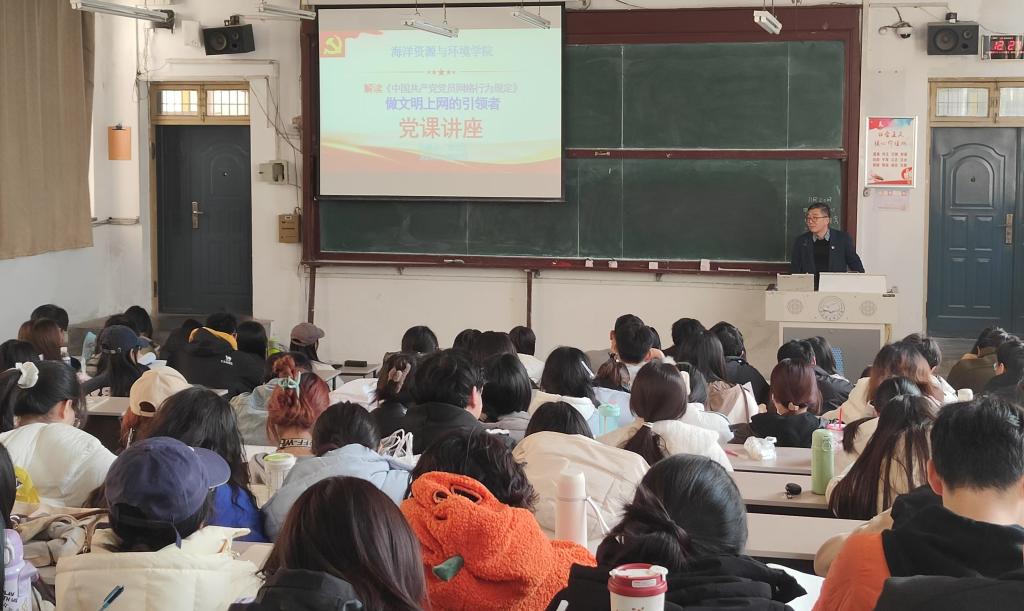 近日,为了规范学生党员网络行为,充分发挥学生党员在网络空间作用,海洋资源与环境学院党委举办关于解读《中国共产党党员网络行为规定》的党课讲座。本次讲座由学院学生工作负责同志主讲,学院全体学生党员、发展对象、入党积极分子参加了此次讲座。