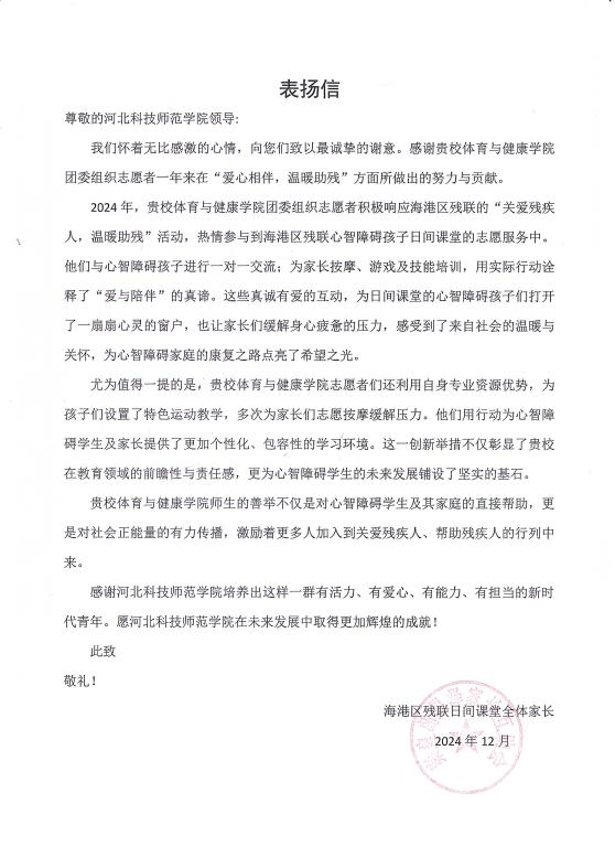 新学期伊始,海港区残联向完美网页版发来感谢信,对完美网页版培养出有活力、有爱心、有能力、有担当的新时代青年表示感谢,对体育与健康学院师生在助残方面做出的努力与贡献表示感谢。