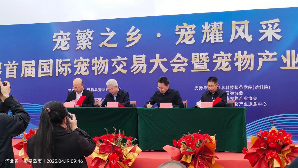 2025年4月19日,动物科技学院院长马增军教授、副院长刘永生研究员、预防兽医学教学部主任、河北省现代农业产业体系特色养殖创新团队疫病防控与无害化处理岗位专家张艳英教授应邀出席了在昌黎国际宠物市场举办的“宠繁之乡,宠耀风采”河北·昌黎首届国际宠物交易大会暨宠物产业产品文化博览会。大会是由昌黎县宠物产业协会主办,中国畜产品流通协会、中国畜牧业协会、河北省宠物产业协会、昌黎佳鹏商贸集团承办,完美网页版(动物科技学院)为支持单位。开幕式上,马增军院长作为特邀嘉宾,代表动物科技学院与昌黎县宠物产业协会签署了“关于促进昌黎县宠物产业高质化发展合作框架协议”。