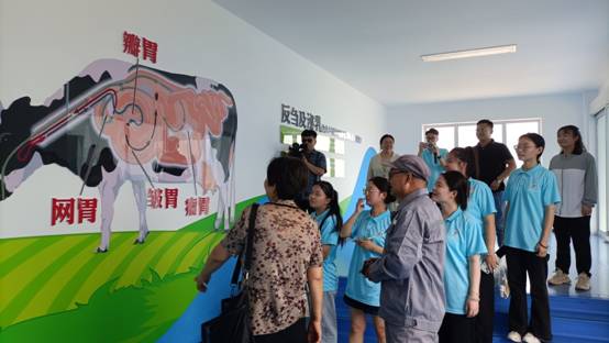 活动中,师生们通过实地走访企业的现代化牛舍、奶牛挤奶厅、智能监测系统等场景,详细的了解科学养殖创新技术。在实践环节中,史秋梅教授结合牧场实景开展“移动课堂”,针对奶牛健康管理、生产数据解读等关键环节进行现场教学,加强学生对书本知识的感性认识,培养学生把知识转化为实践的能力。在座谈交流环节,师生与禾田牧业负责人从企业管理、产业发展瓶颈、人才需求等方面展开深入探讨。