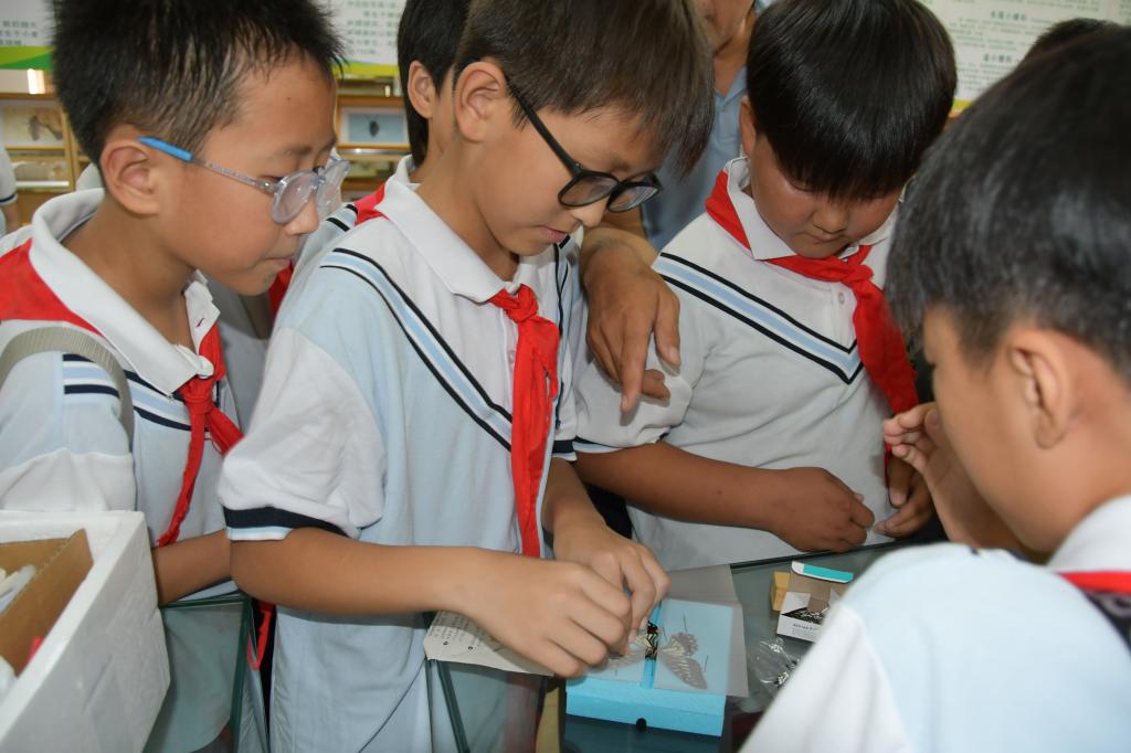 生物标本馆工作人员在冀东农林害虫天敌昆虫展厅为小学生讲解