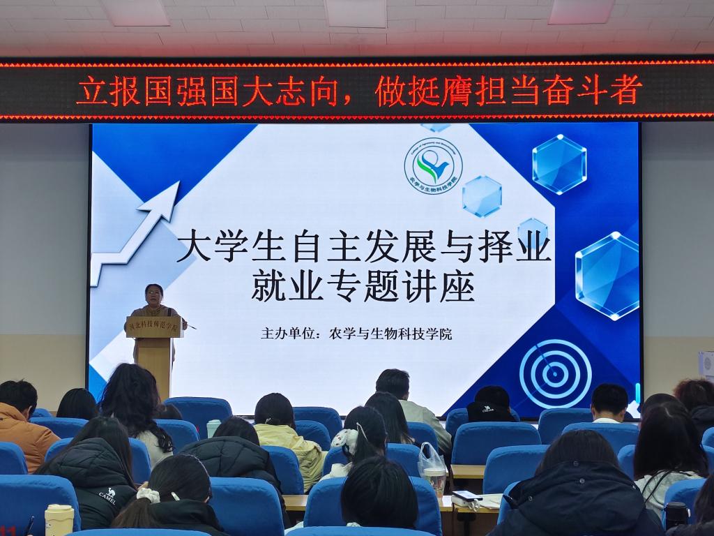 2025年11月6日,农学与生物科技学院在学术报告厅举办以“深耕农科学业・明晰就业方向”为主题的大学生自主发展及择业就业专题讲座。本次讲座由学院主管学生工作的领导主讲,450余名学生积极参与。