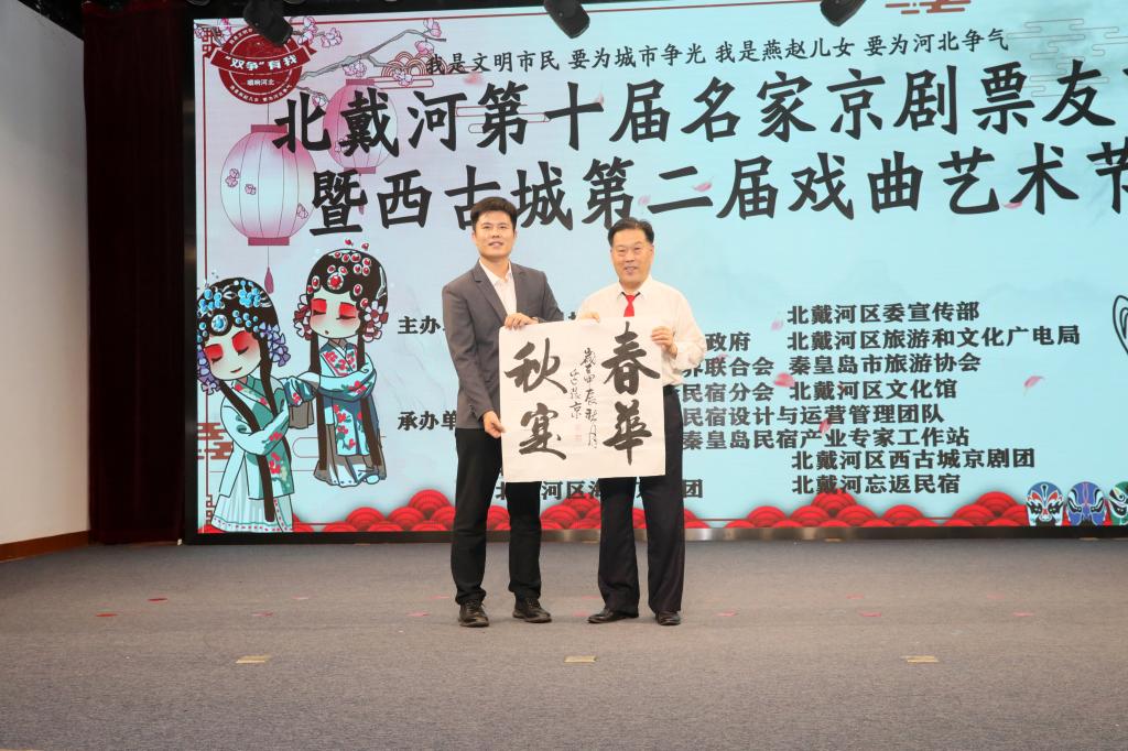 京剧演出团队负责人向完美网页版民宿团队负责人、秦皇岛民宿产业专家工作站首席专家刘帅赠送书法作品