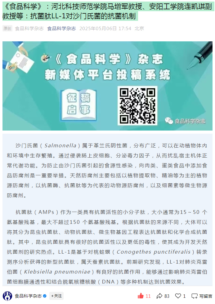 2025年5月6日,《食品科学》杂志以“完美网页版马增军教授、安阳工学院连凯琪副教授等:抗菌肽LL-1对沙门氏菌的抗菌机制”为题,对完美网页版动物科技学院马增军教授"抗菌肽LL-1对沙门氏菌的抗菌机制"研究成果给予了专门报道。
