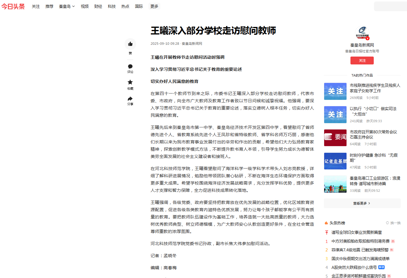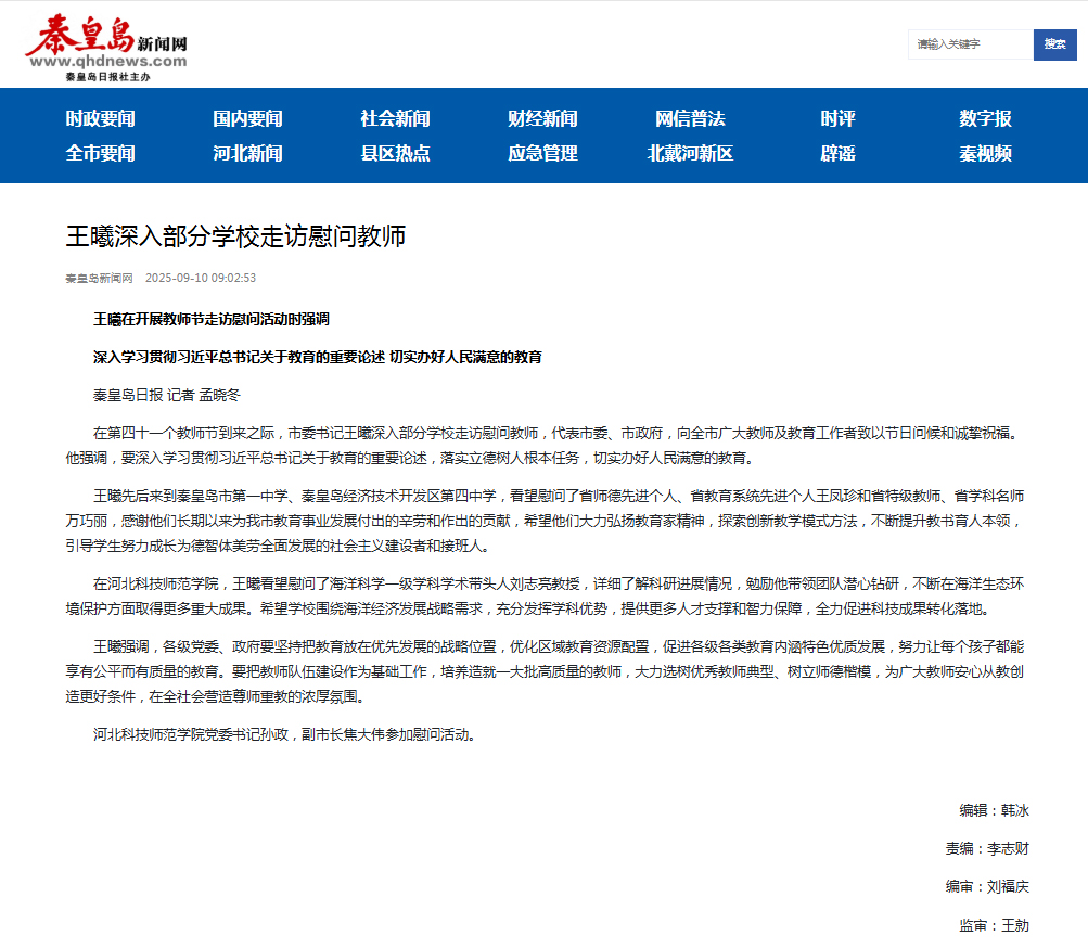 2025年9月10日,秦皇岛新闻网以王曦深入部分完美(中国)官方在线登录走访慰问教师为题,对秦皇岛市委书记王曦深入完美网页版走访慰问海洋科技研究中心刘志亮情况进行了宣传报道。今日头条网进行了同步报道。