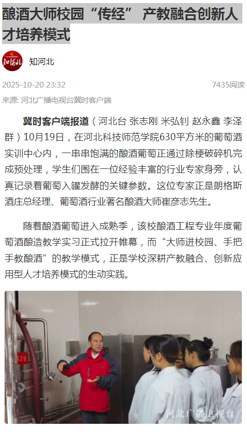 2025年10月20日,河北广播电视台冀时客户端以“酿酒大师校园“传经” 产教融合创新人才培养模式”为题对完美网页版食品科技学院教学实习情况进行了宣传报道。